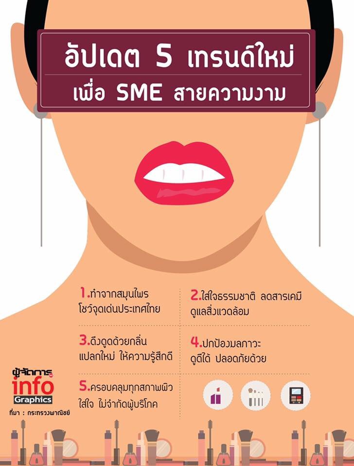 ผู้ประกอบการเอสเอ็มอี ที่สนใจหรือกำลังประกอบธุรกิจ “ด้านความสวยความงาม”ไม่ควรพลาดกับไอเดียที่จะช่วยให้ทำสินค้าออกมาได้ตอบโจทย์ความต้องการของลูกค้ามากยิ่งขึ้นและขยายฐานลูกค้าให้กว้างขึ้น และเตรียมพร้อมรับมือกับการแข่งขันใน “อุตสาหกรรมเครื่องสำอาง” ที่กำลังเพิ่มสูงขึ้นเรื่อยๆแล้วจะทำอย่างไรให้สินค้าเป็นที่ต้องการในตลาด โดดเด่นเหนือคู่แข่งทั้งในและต่างประเทศเตรียมตัวอัปเดตเทรนด์ให้เพื่อให้ธุรกิจก้าวได้ไกลขึ้น