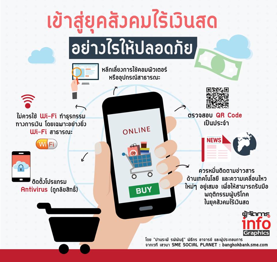 สังคมไร้เงินสด หรือ Cashless Society ที่ใช้รูปแบบการชำระเงินที่เรียกว่า e-Payment ทั้งการใช้จ่ายผ่านบัตรเดบิต/เครดิต โมบายแอปพลิเคชันของธนาคาร และ e-Wallet หรือกระเป๋าเงินอิเล็กทรอนิกส์แทนเงินสด ซึ่งผู้ใช้บริการสามารถทำธุรกรรมการเงินต่างๆ ผ่านอุปกรณ์อิเล็กทรอนิกส์ เช่น โทรศัพท์มือถือ หรือคอมพิวเตอร์